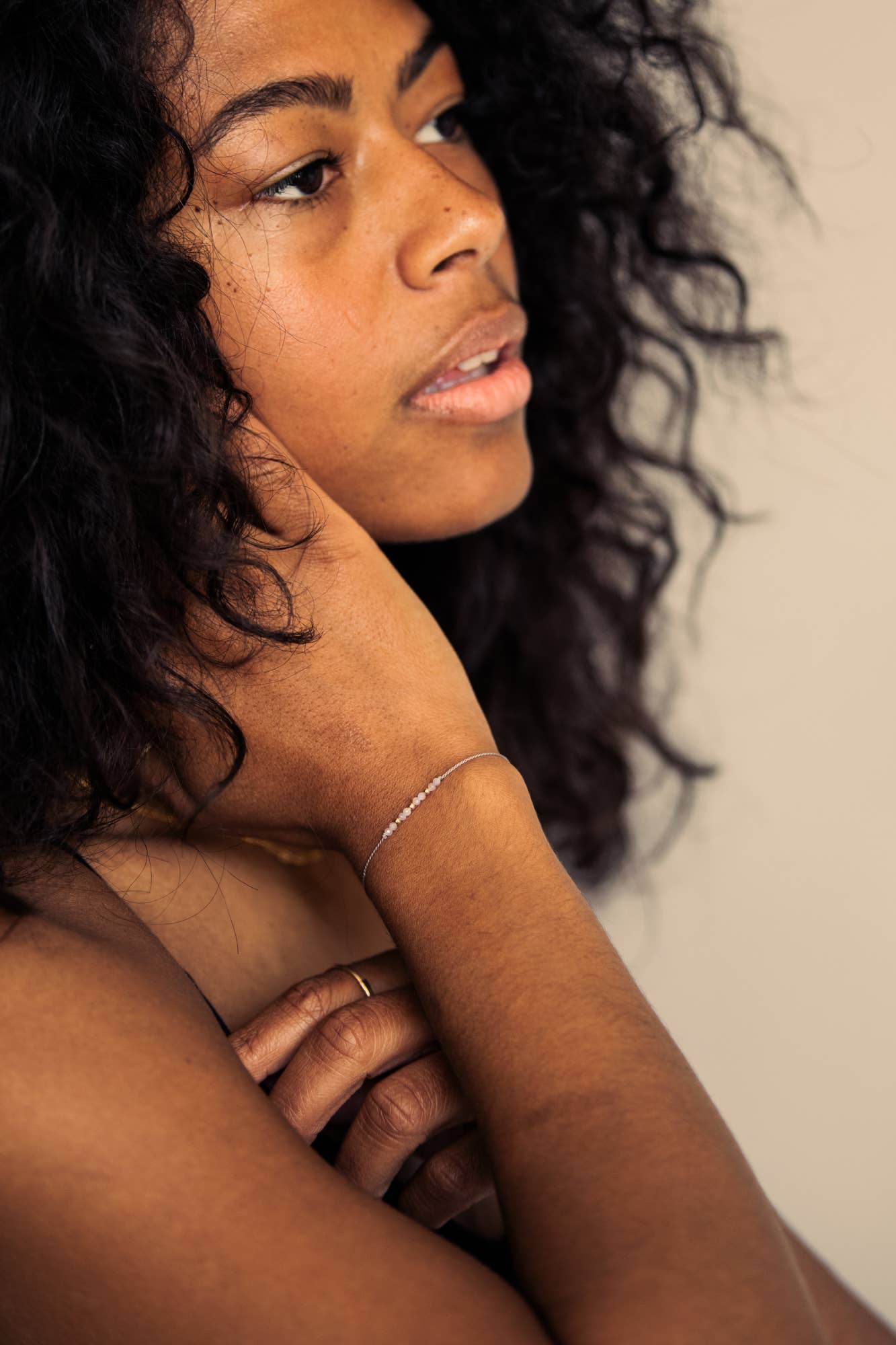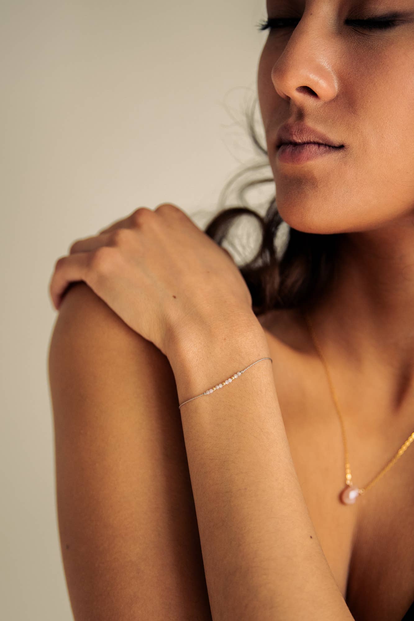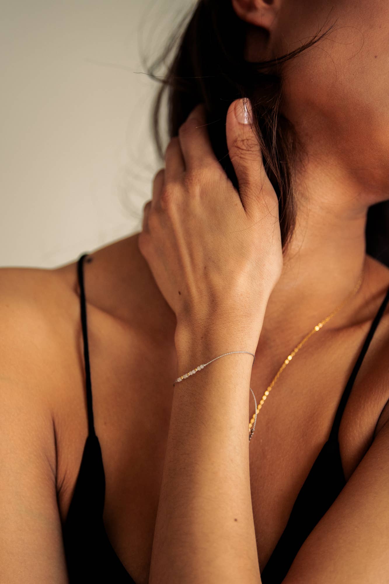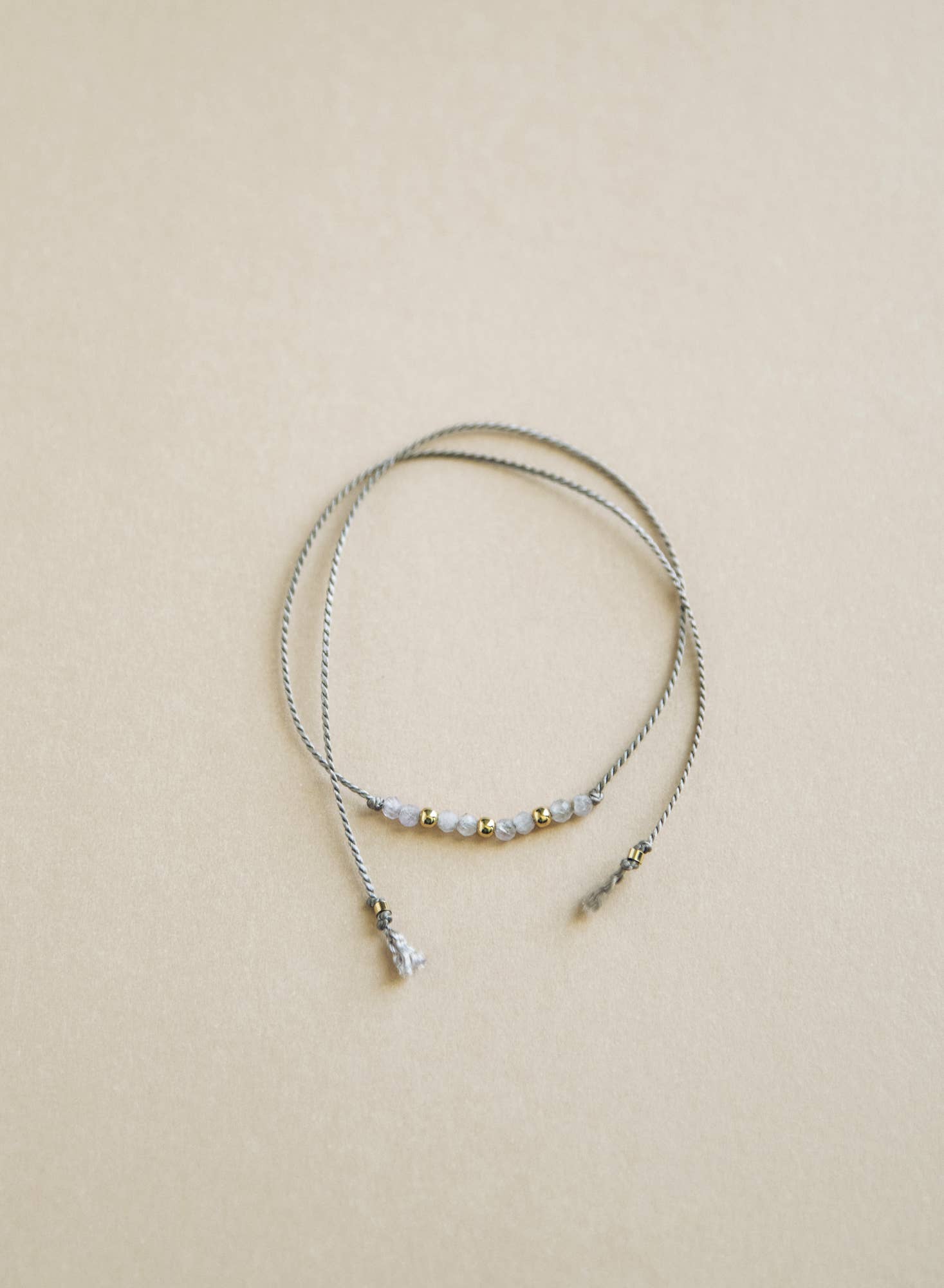 Beautiful, dainty and minimalistic string bracelet made from 100% silk and 2-3mm faceted natural kunzite crystal and 14K gold.