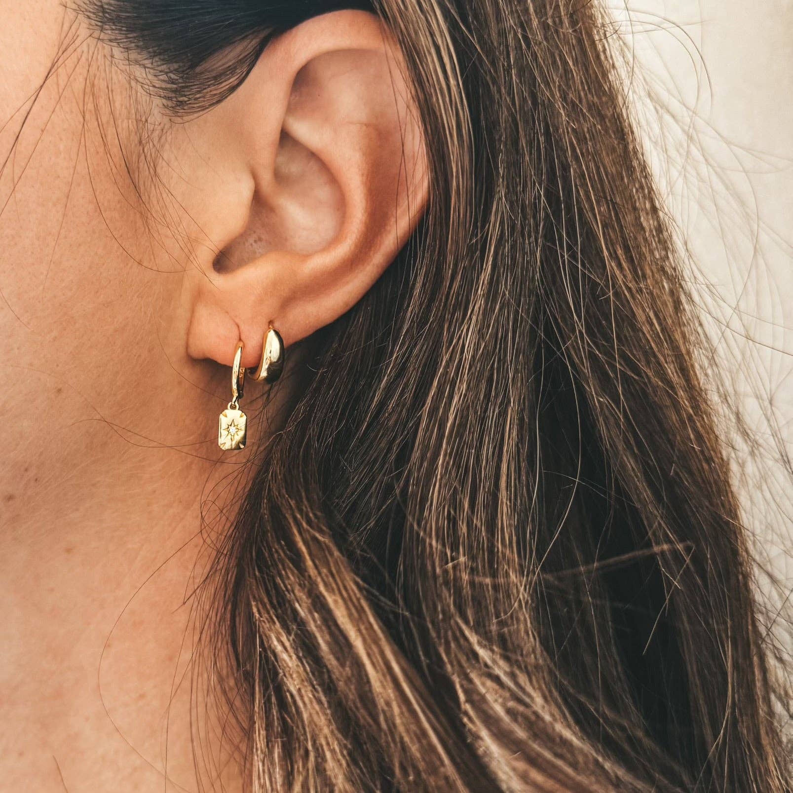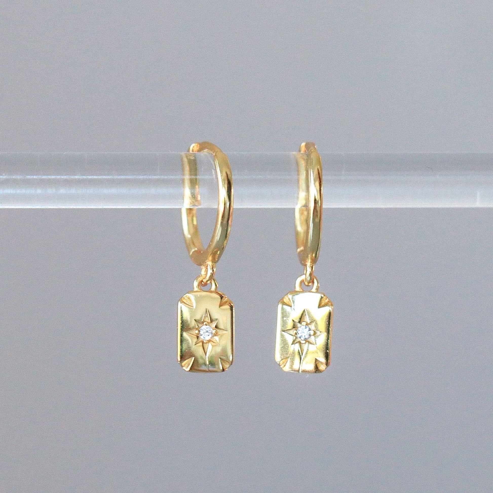 Sleeper hoop earrings. Find a small delicate pendant in the shape of a rectangle with engraving and clear zircon.