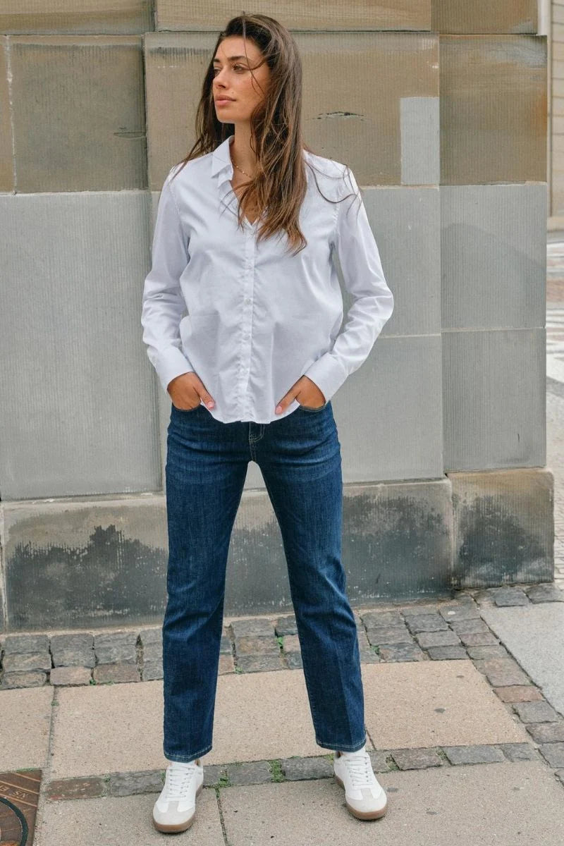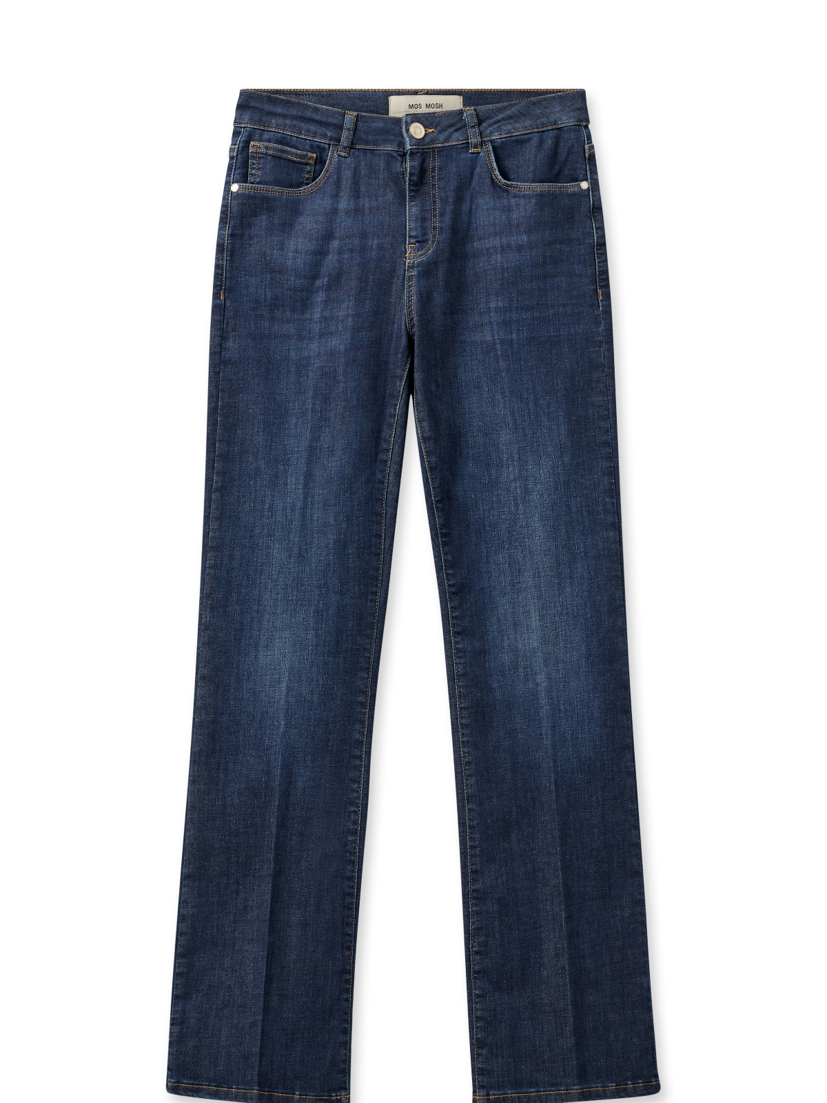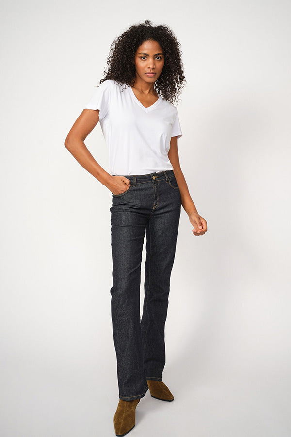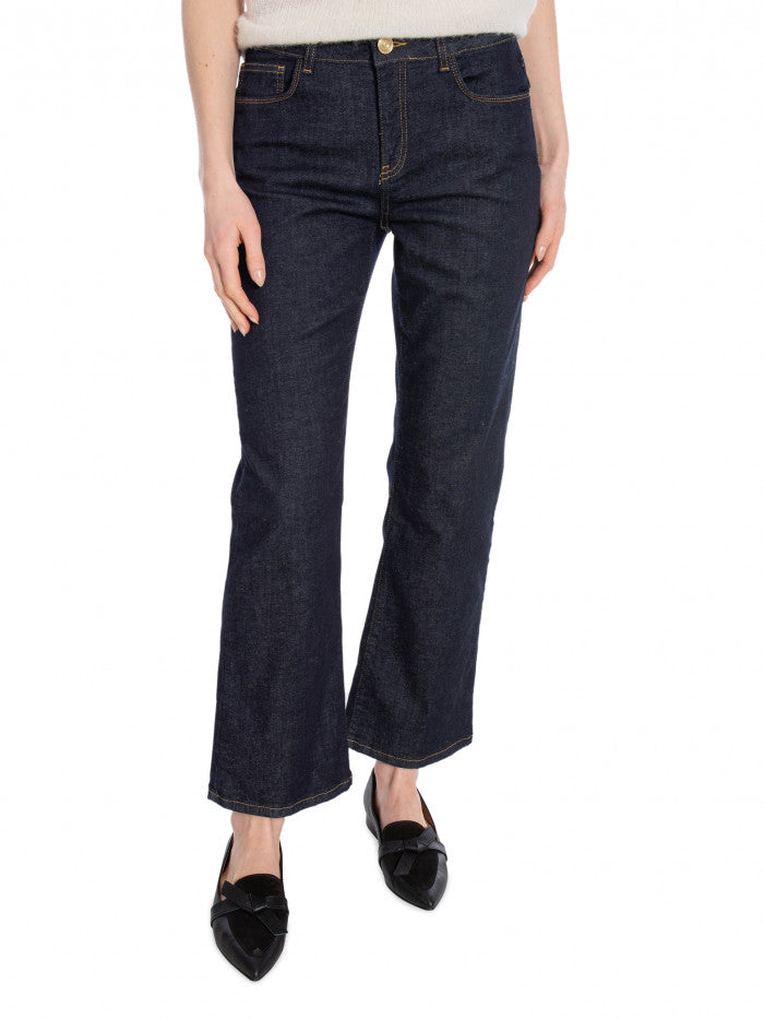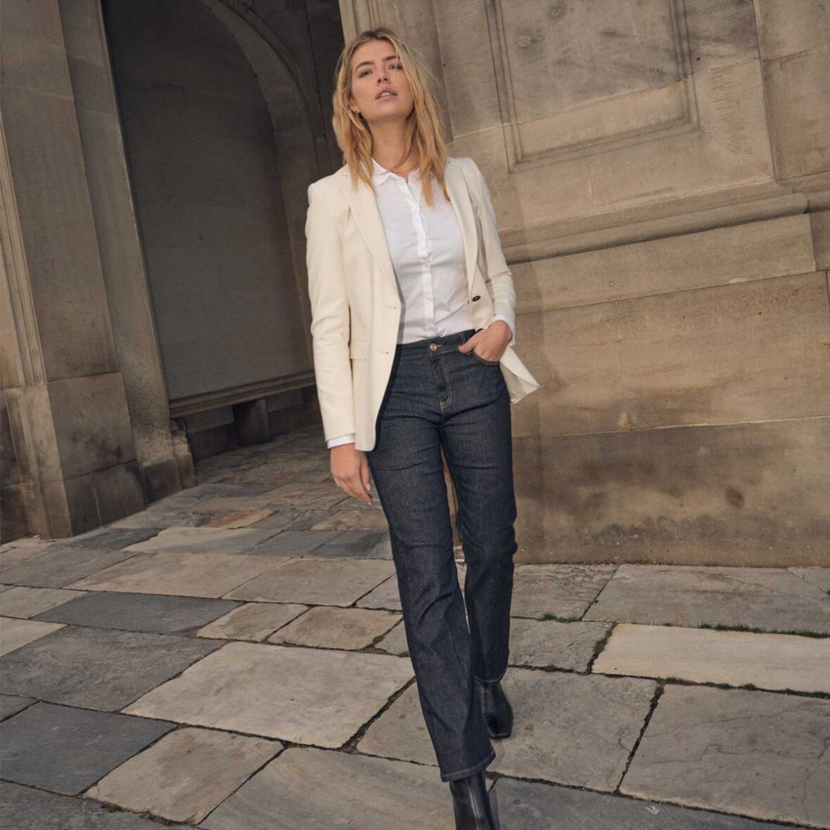 Add a boy-ish spin to your outfit with these box-cut jeans with high-rise. Constructed from recycled cotton and polyester. Finished with ankle length that kicks to a slight flare and pressed creases, giving them a cool ‘70s retro feel. Tuck in an oversize shirt and pair yours with ankle boots.