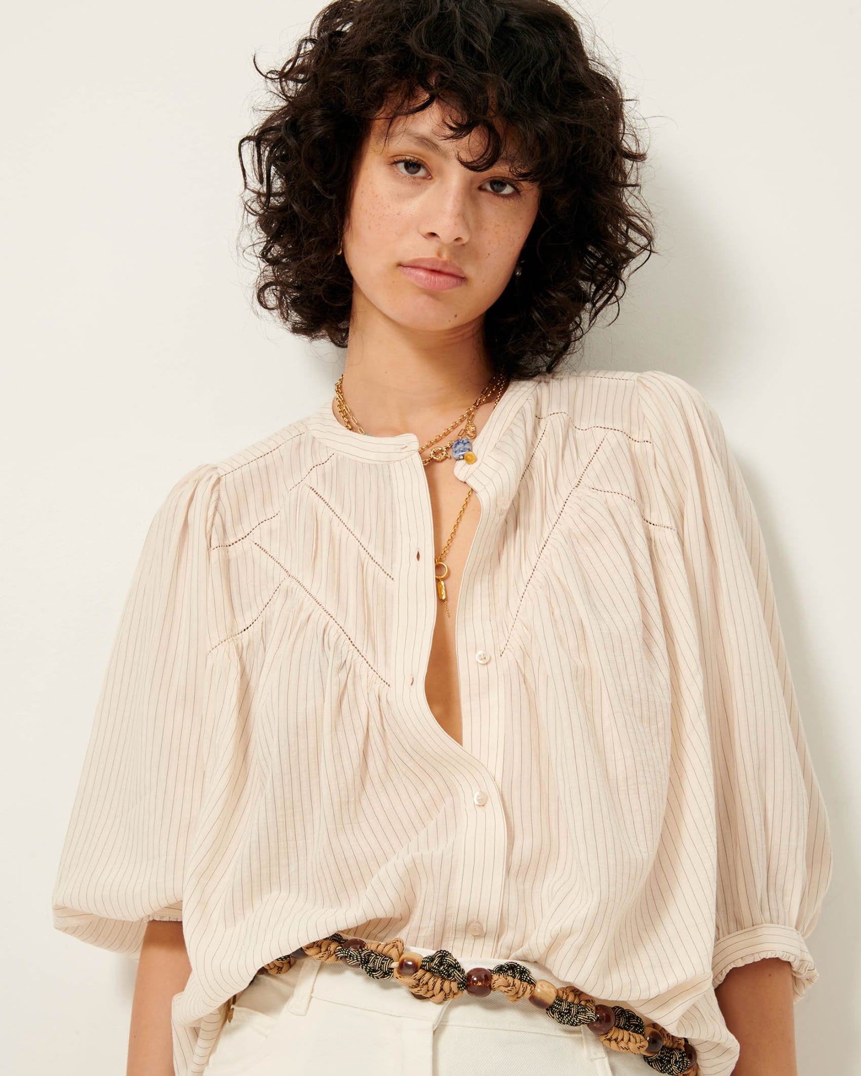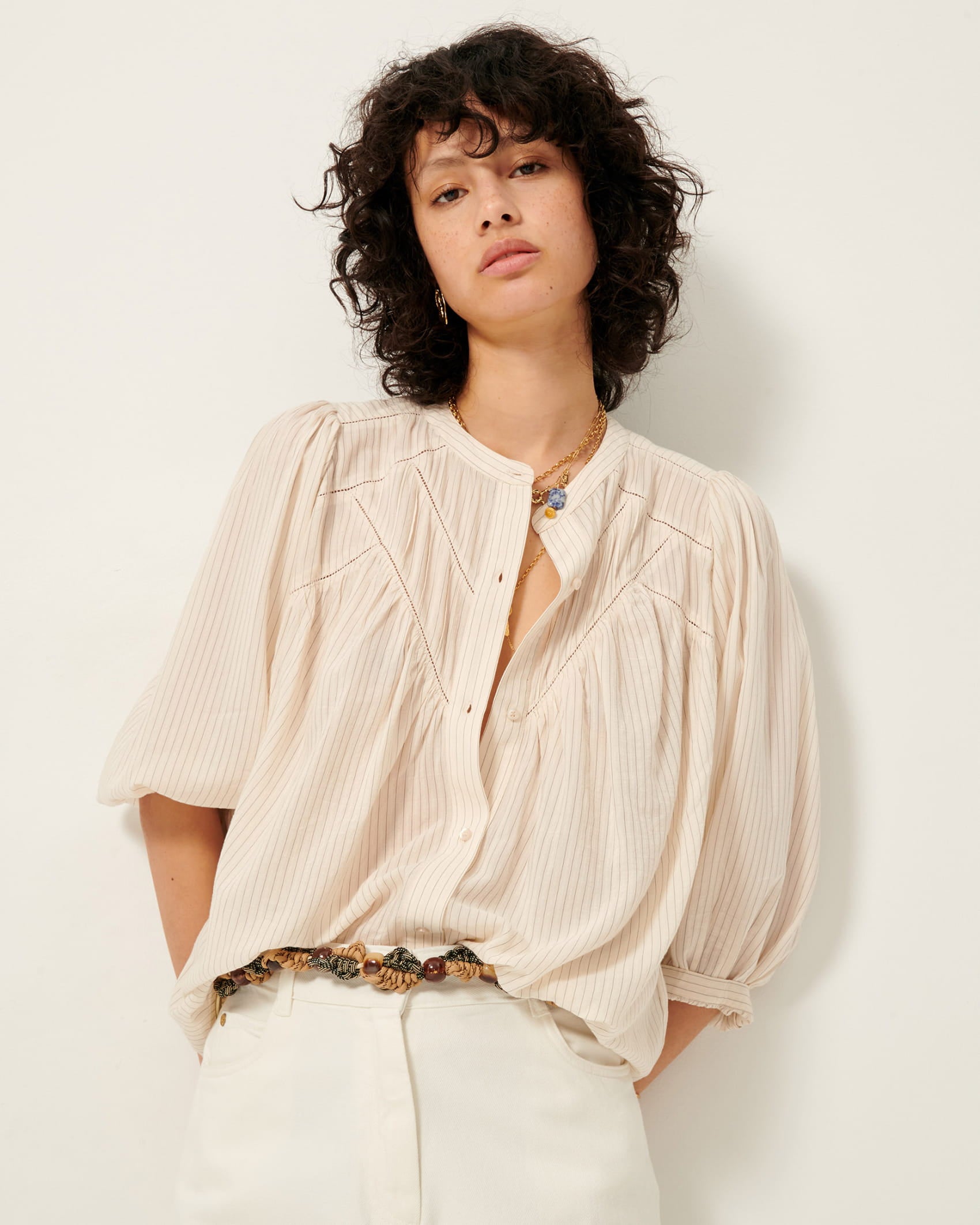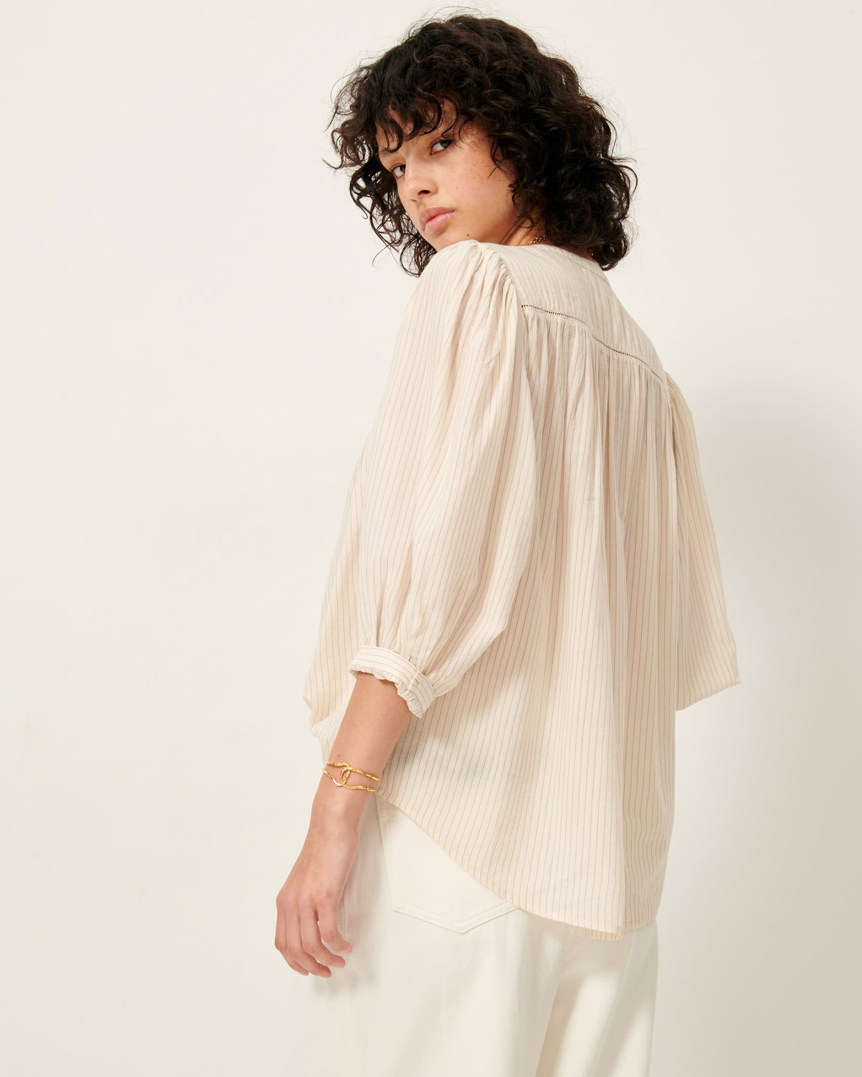 Balloon sleeved blouse with ladder openwork and mini knife pleats in a textured jacquard lawn fabric with fine contrasting stripes.