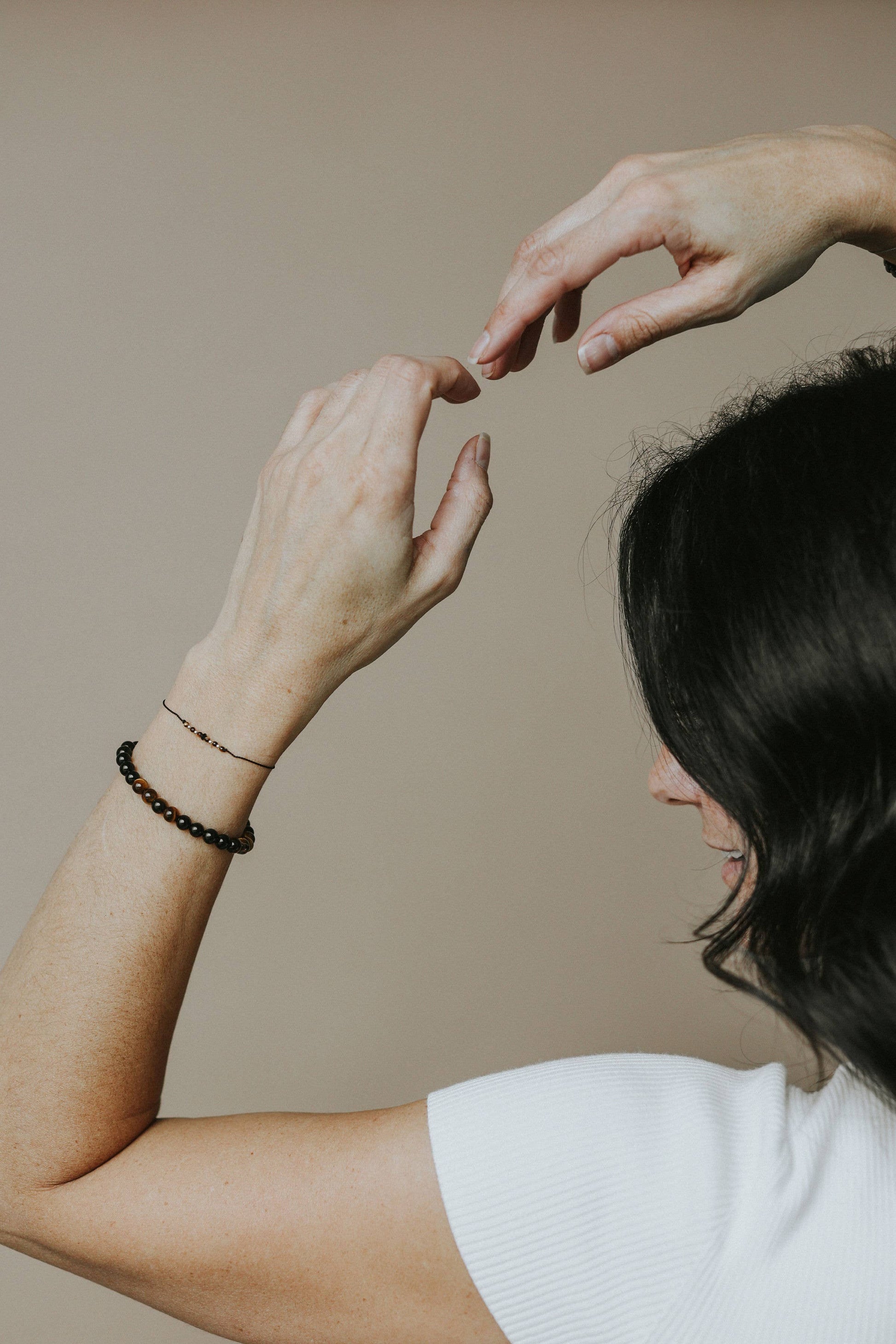 Beautiful, dainty and minimalistic string bracelet made from 100% silk string, made with 2-3mm faceted tigers eye and black bicone crystal. Special wish for strength written on the card. Recite it as you tie the bracelet on.
