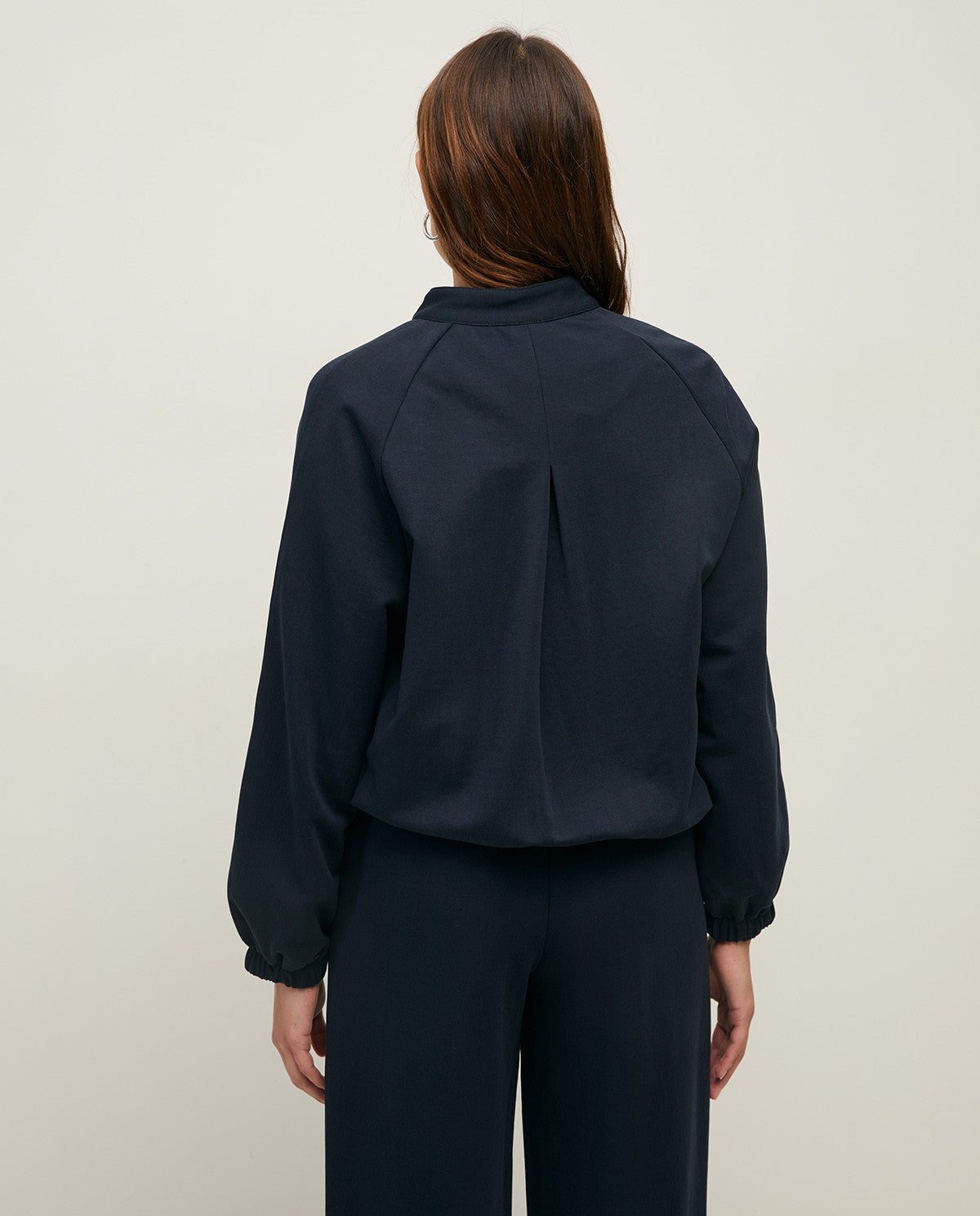 Navy-blue bomber jacket. Mao neck and two-way zip. Pleats on the neckline. Pleat in back. Long raglan sleeves and elastic cuffs. Lining. Two front pockets.